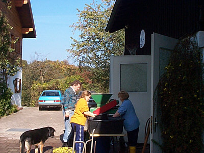 Beim Maischen wird auf besondere Exaktheit geachtet, da jede Verunreinigung den Geschmack des fertigen Produktes beeinträchtigen kann. So wird bei uns generell fauliges Obst aussortiert und angefaultes, sofern möglich, ausgeschnitten. Auf dem Bild leider nur schlecht zu erkennen, bei uns wird auch jede Frucht, bevor sie in der Obstmühle zerkleinert wird, gewaschen. |